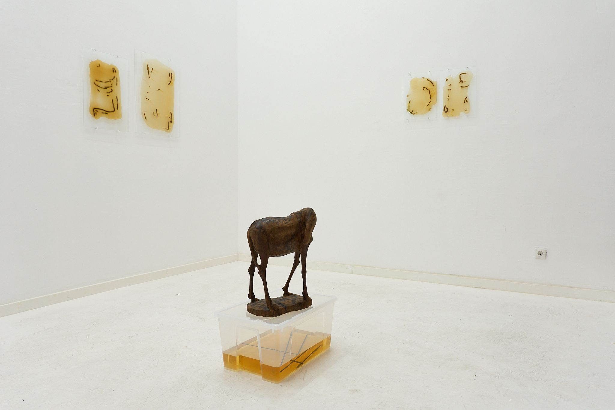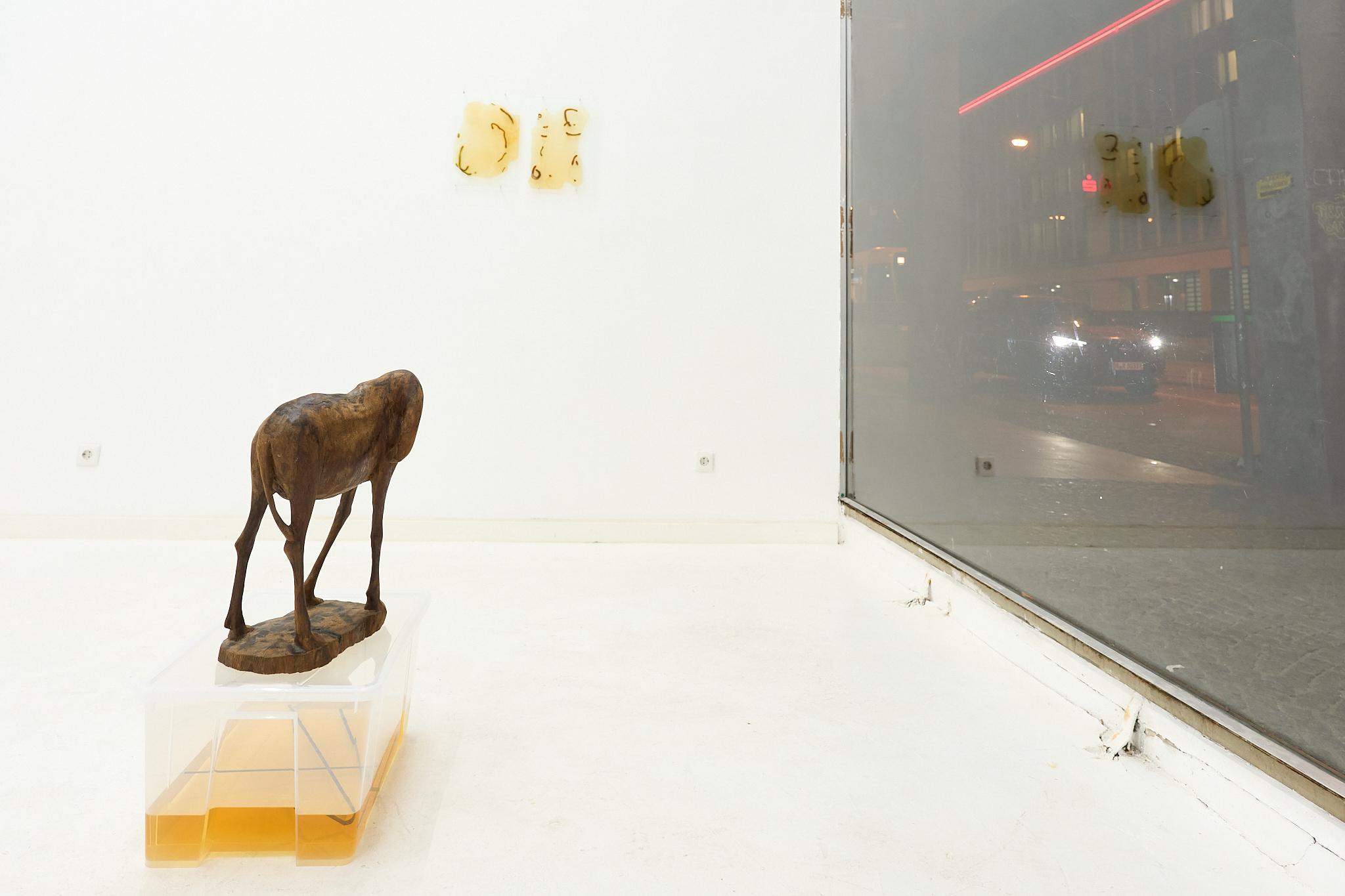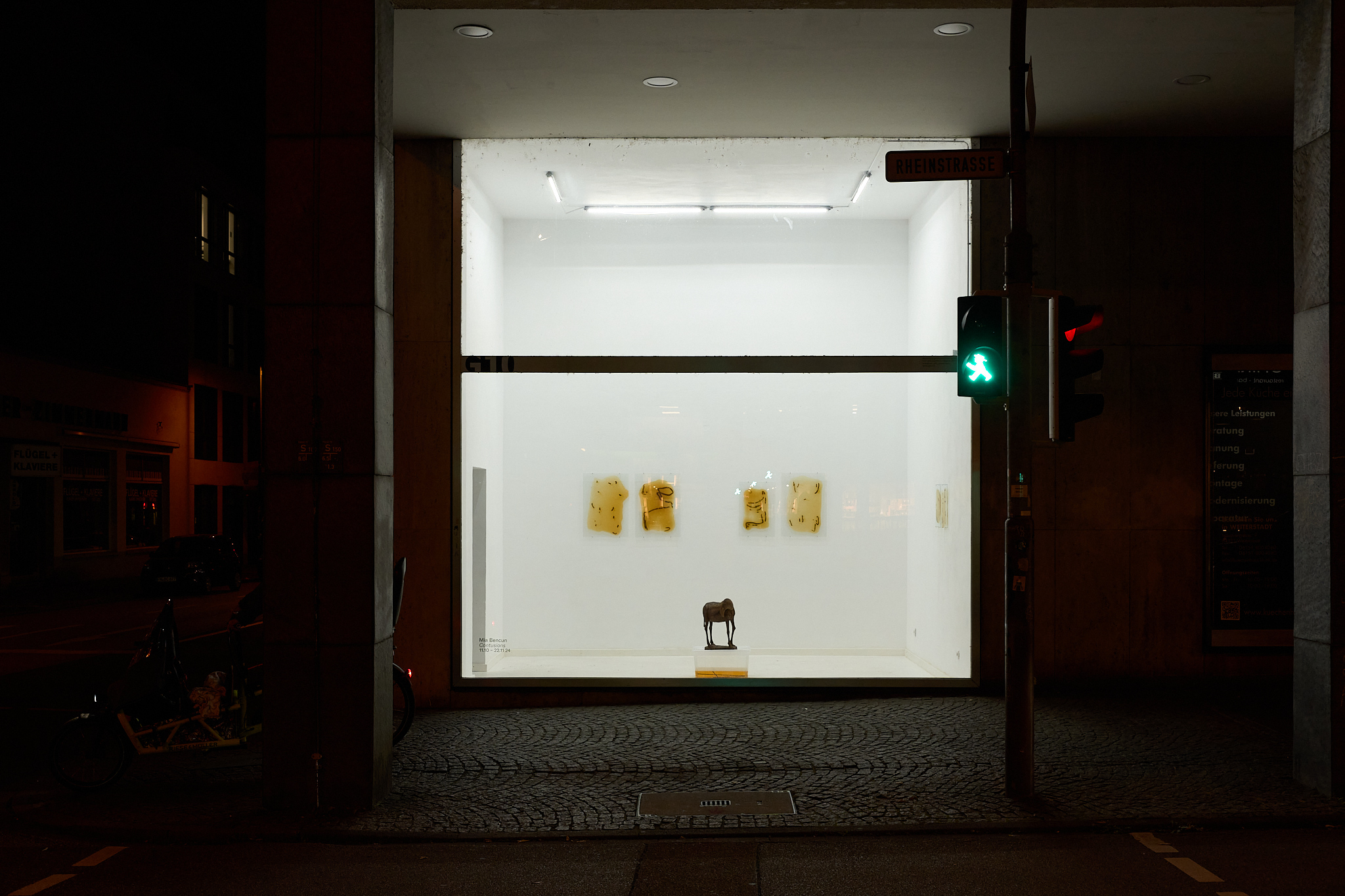 In the G10 Projektraum, the artist presents various new works from her Bruiseseries. The exhibited wall objects consist of natural materials such as latex (made from natural rubber) as well as more durable inorganic ones such as glass and copper. Brownish-yellow, abstract shapes, created by a chemical reaction, writhe in a milky-soft surface. Some areas crack and deform over time; oxidation and slow decay lead to non-figurative traces which resemble abstract paintings. The more time passes, the more the works change and show evidence of their transience. A specific physicality is created by the surface structure: the latex, which bursts in some points, reminds the viewer of skin, frozen liquid or microscopically enlarged viral formations.