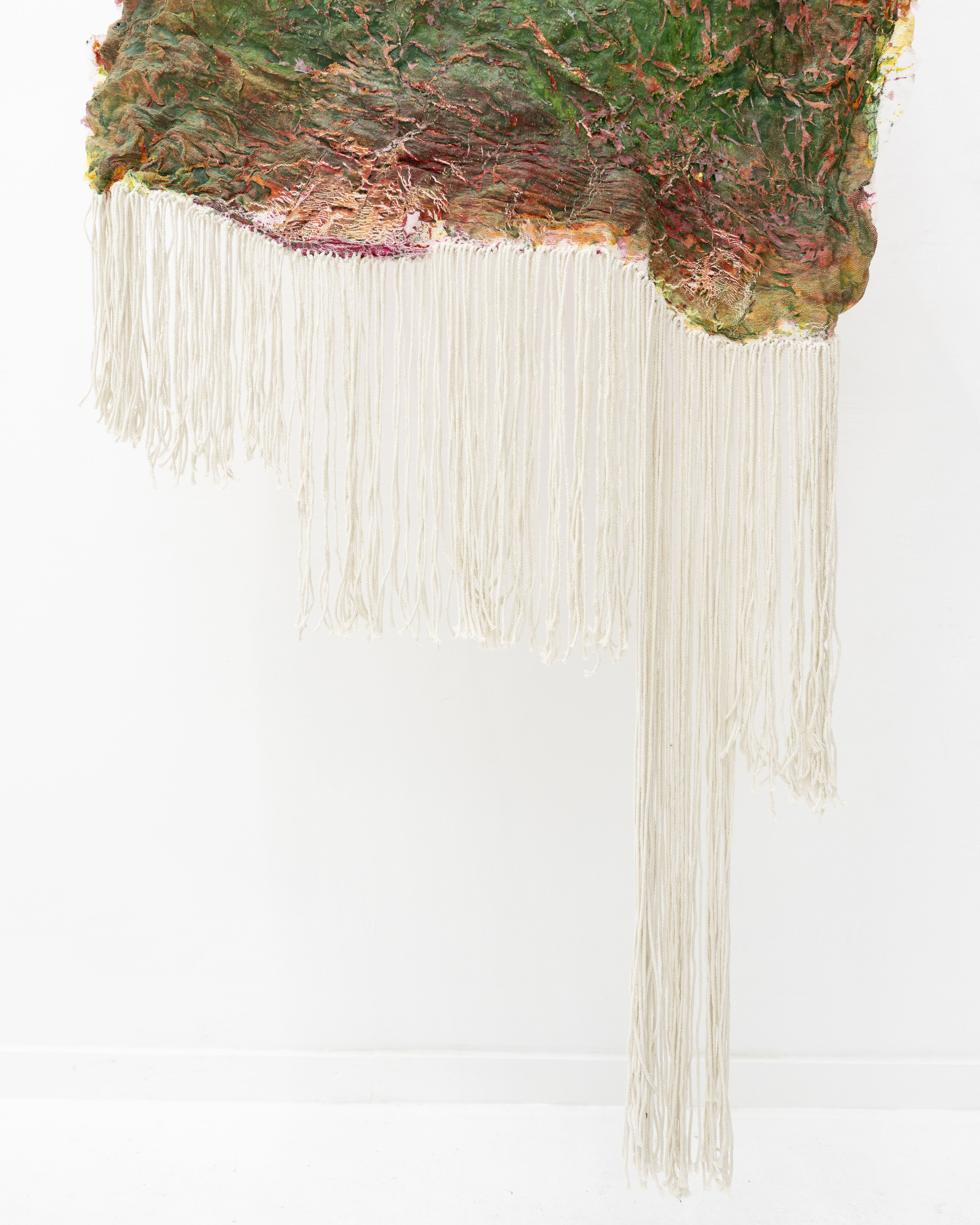 The wall objects on display are created through a process in which the artist builds her pieces layer by layer. They consist of superimposed materials such as plastic particles, agar-agar, ink, and pigments. As they dry, these substances change their state, forming cracks, folds and crusts – visible traces of a transformation. The solidified, uneven surfaces evoke organic processes, healing wounds or earthy, land-like structures. These transitions reveal a moment of agency – a kind of self-activity of the materials – that transcends the boundaries between solid and liquid and opposes the supposed passivity of matter. From the undersides of the works hang cotton threads reminiscent of carpet fringes. They create a dynamic tension between fabric and growth, between a constructed and a seemingly organic surface.